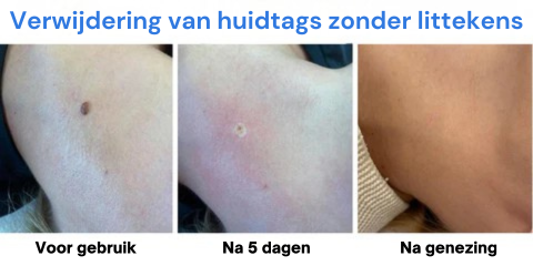 "Ik vond het vreselijk hoe pijnlijk mijn huidtag was wanneer deze aan mijn kleding bleef haken, vooral wanneer ik een shirt aantrok. Ik besloot om er vanaf te komen, maar wilde geen operatie ondergaan. Gelukkig vond ik dit product en het heeft mijn huidtag echt volledig pijnloos verwijderd! - ⭐⭐⭐⭐⭐"