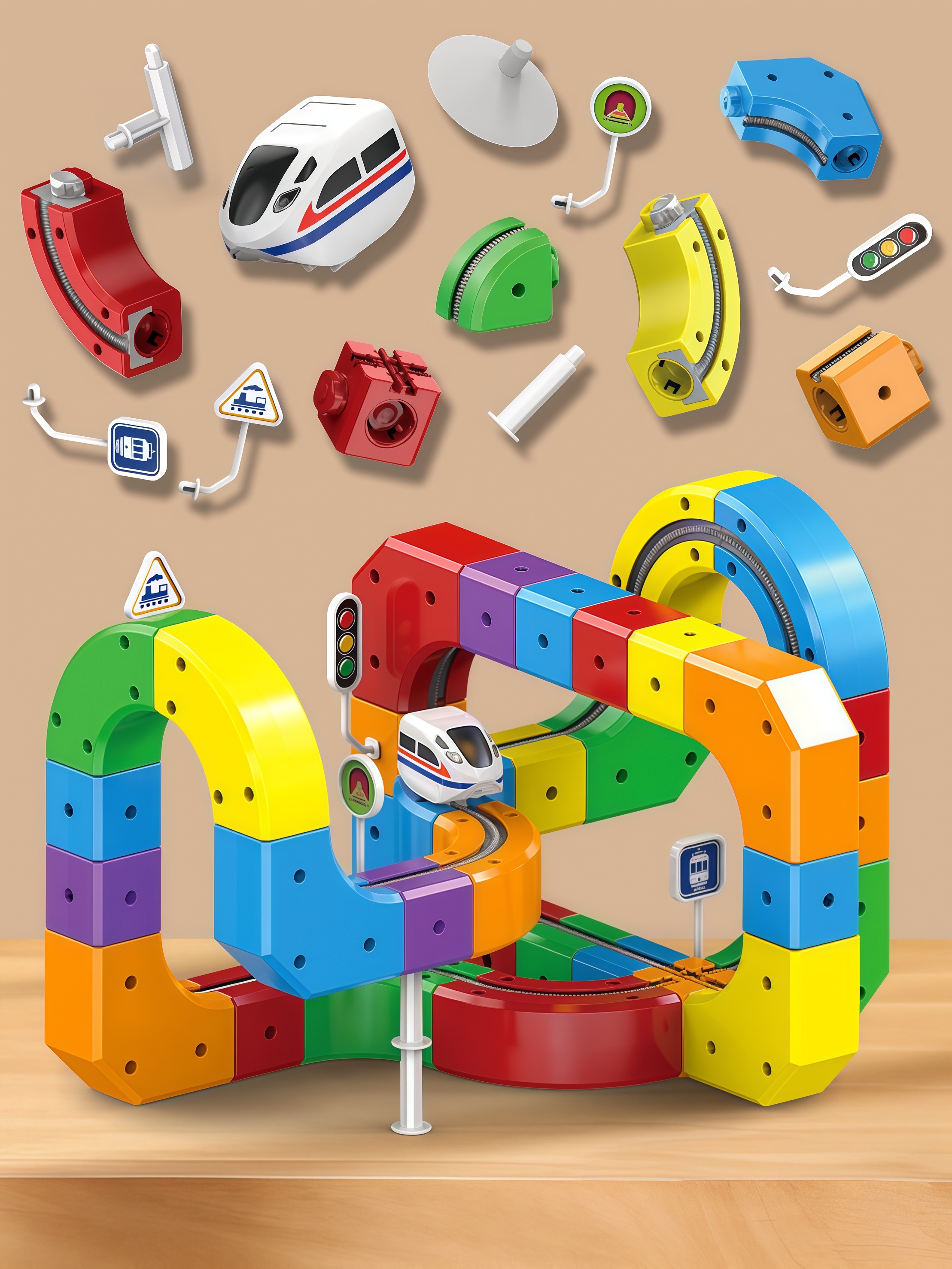 The set includes building blocks and modules with straight tracks, curves, ascending tracks, circular tracks and other track components, as well as accessories such as traffic signs (traffic lights, stop signs, wayfinding signs) and model trains. This allows for the construction of multi-level track layouts such as spiral tracks, crossing tracks or tracks with elevation changes.