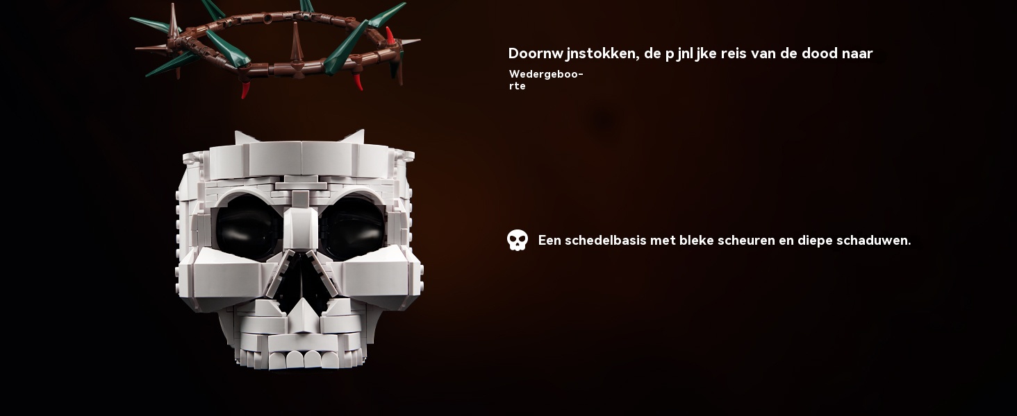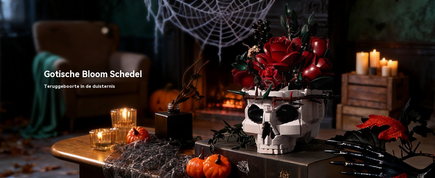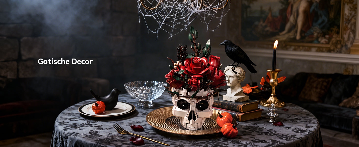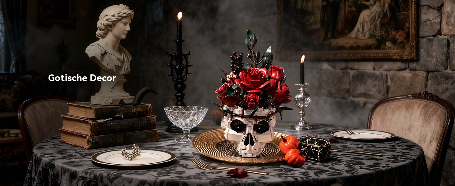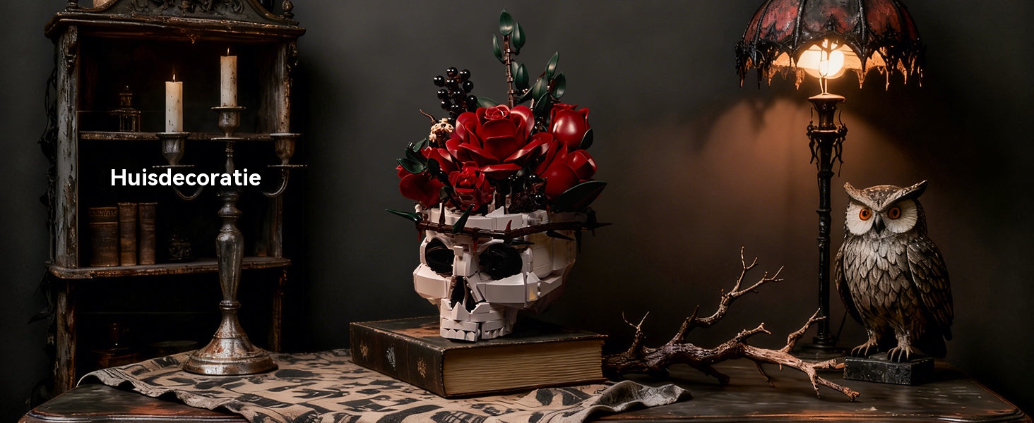 Gotische schedel met rode rozenboeket bouwstenenset
