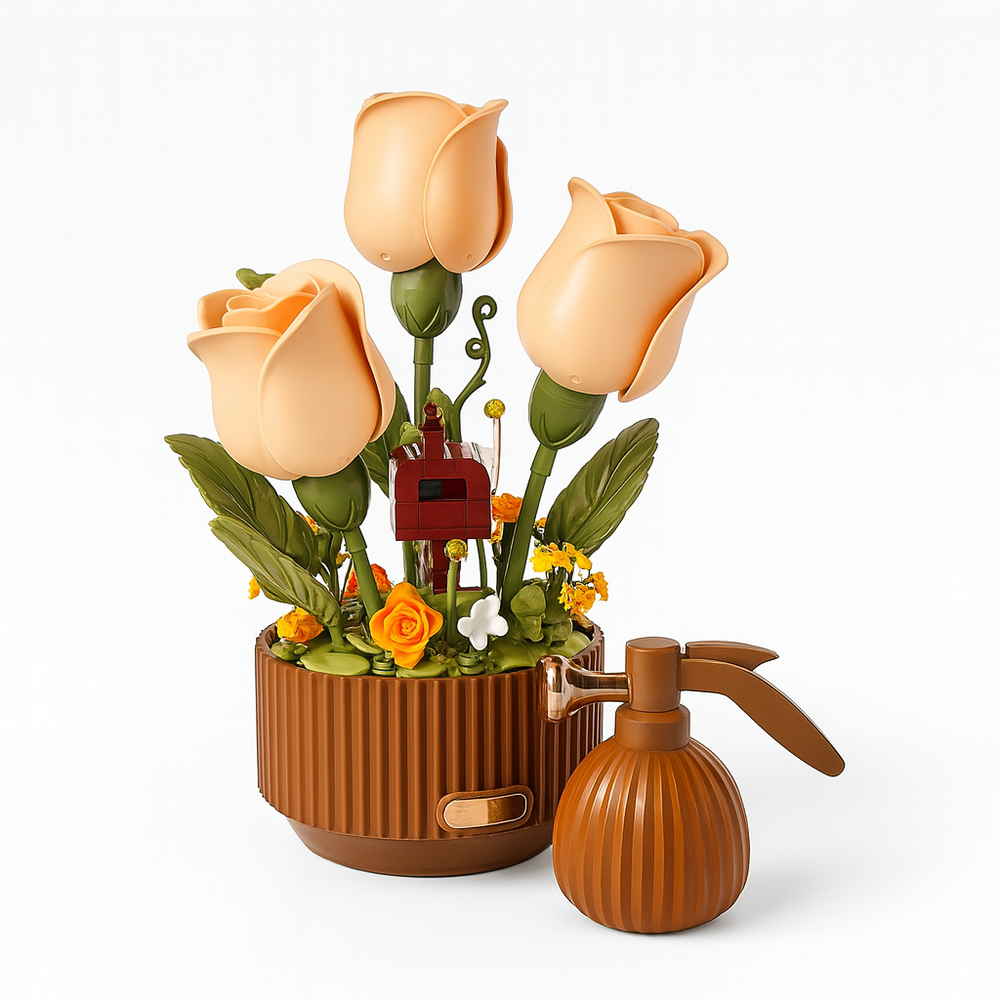 3 Articulated roses, 1 water can, 255 pieces to assemble, 1 charging cable (Type C) and 1 user manual